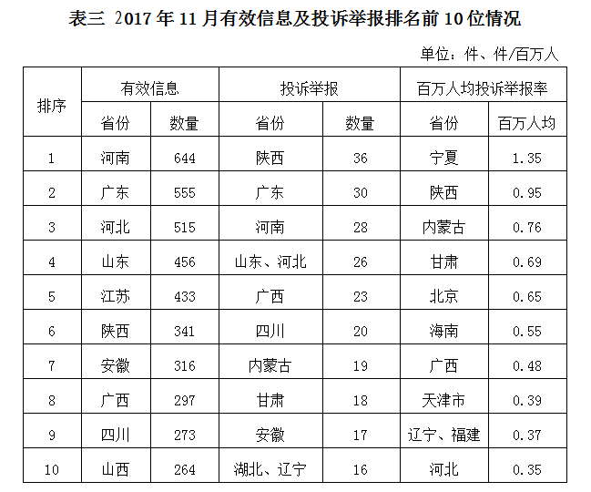 2017年11月,各?。ㄗ灾螀^(qū)、直轄市)按照有效信息數(shù)量排序,河南、廣東、河北等省列全國(guó)前10位;按照投訴舉報(bào)數(shù)量排序,陜西、廣東、河南等省排在全國(guó)前10位;按照百萬人均投訴舉報(bào)率排序,寧夏,陜西,內(nèi)蒙古等省位于全國(guó)前10位。(2017年11月有效信息及投訴舉報(bào)排名前10位情況見表三)