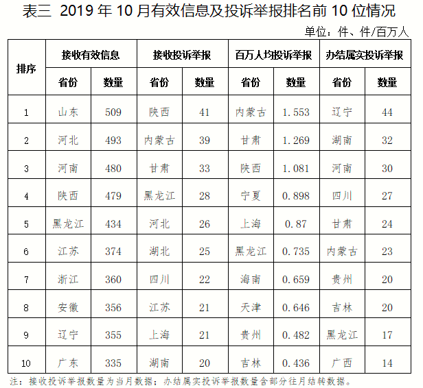 各?。ㄗ灾螀^(qū)、直轄市)按照收到的有效信息數(shù)量排序,山東、河北、河南、陜西、黑龍江等列全國前10位;按照投訴舉報數(shù)量排序,陜西、內蒙古、甘肅、黑龍江、河北等排在全國前10位;按照百萬人均投訴舉報數(shù)量排序,內蒙古、甘肅、陜西、寧夏、上海等排在全國前10位;按照辦結屬實投訴舉報數(shù)量排序,遼寧、湖南、河南、四川、甘肅等排在全國前10位。(2019年10月有效信息及投訴舉報排名前10位情況見表三)