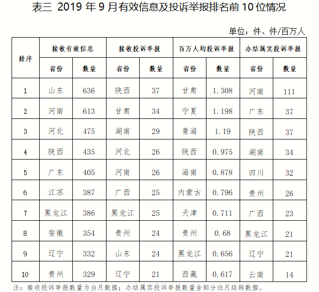 各?。ㄗ灾螀^(qū)、直轄市)按照收到的有效信息數(shù)量排序,山東、河南、河北、陜西、廣東等排在全國前10位;按照投訴舉報數(shù)量排序,陜西、甘肅、湖南、河北、河南等排在全國前10位。按照百萬人均投訴舉報數(shù)量排序,甘肅,寧夏,青海,陜西,海南等排在全國前10位。按照辦結(jié)屬實投訴舉報數(shù)量排序,河南、廣東、陜西、湖南、四川等排在全國前10位。(2019年9月有效信息及投訴舉報排名前10位情況見表三)