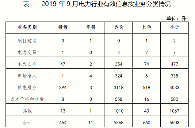 電力行業(yè)排在首位,有效信息數(shù)量為6503件,占全部有效信息的77.62%;其中受理的投訴舉報數(shù)量為475件,占全部投訴舉報數(shù)量的94.81%。群眾反映的問題主要集中在供電服務(wù)、電力安全、成本價格和收費等方面。(2019年9月電力行業(yè)有效信息按業(yè)務(wù)分類情況見表二)