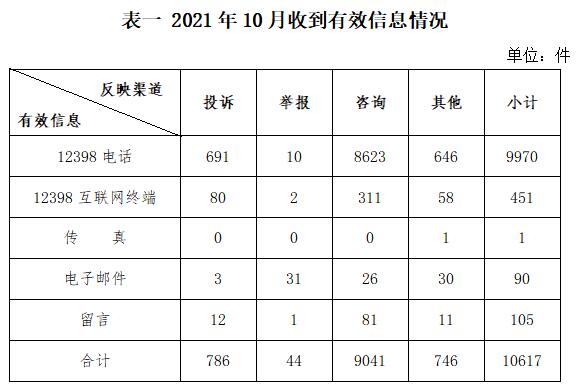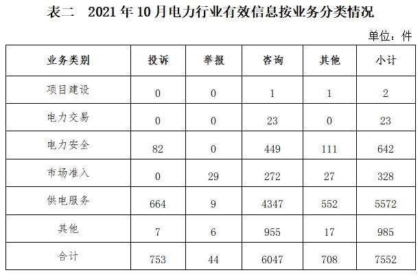 2021年10月,國家能源局12398能源監(jiān)管熱線(以下簡稱12398熱線)共收到有效信息10617件(包含投訴、舉報、咨詢和其他訴求類別),環(huán)比減少13.63%,同比增加26.03%。(2021年10月收到有效信息情況見表一)