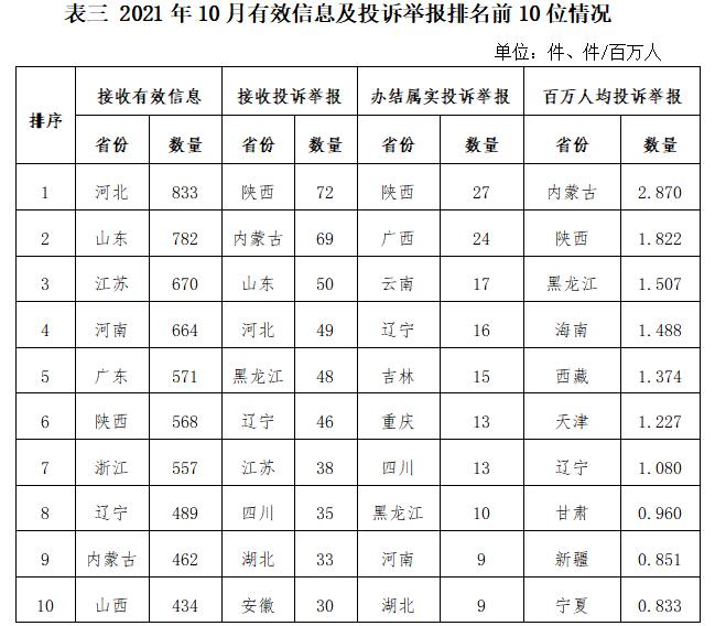 各省(自治區(qū)、直轄市)按照接收的有效信息數(shù)量排序,河北、山東、江蘇、河南、廣東、陜西、浙江、遼寧、內(nèi)蒙古、山西列全國前10位;按照接收的投訴舉報數(shù)量排序,陜西、內(nèi)蒙古、山東、河北、黑龍江、遼寧、江蘇、四川、湖北、安徽排在全國前10位;按照辦結(jié)屬實的投訴舉報數(shù)量排序,陜西、廣西、云南、遼寧、吉林、重慶、四川、黑龍江、河南、湖北排在全國前10位;按照百萬人均投訴舉報數(shù)量排序,內(nèi)蒙古、陜西、黑龍江、海南、西藏、天津、遼寧、甘肅、新疆、寧夏排在全國前10位。(2021年10月有效信息及投訴舉報排名前10位情況見表三)