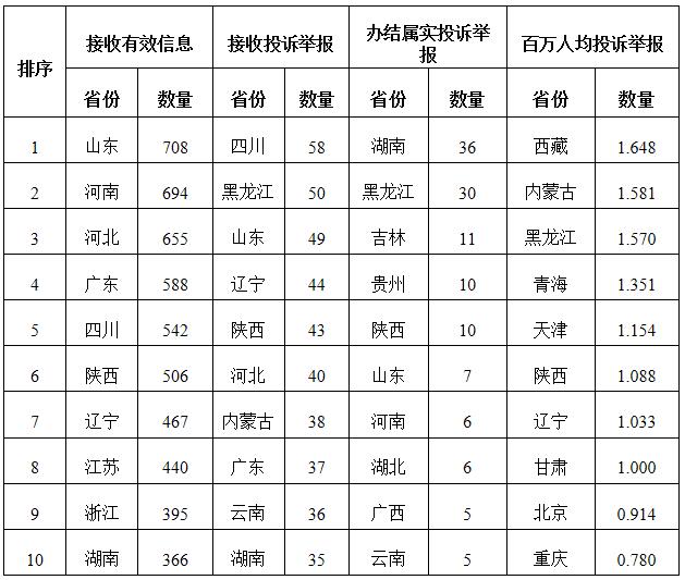 各省(自治區(qū)、直轄市)按照接收的有效信息數(shù)量排序,山東、河南、河北、廣東、四川、陜西、遼寧、江蘇、浙江、湖南排在全國前10位;按照接收的投訴舉報(bào)數(shù)量排序,四川、黑龍江、山東、遼寧、陜西、河北、內(nèi)蒙古、廣東、云南、湖南排在全國前10位;按照辦結(jié)屬實(shí)的投訴舉報(bào)數(shù)量排序,湖南、黑龍江、吉林、貴州、陜西、山東、河南、湖北、廣西、云南排在全國前10位;按照百萬人均投訴舉報(bào)數(shù)量排序,西藏、內(nèi)蒙古、黑龍江、青海、天津、陜西、遼寧、甘肅、北京、重慶排在全國前10位。(2022年4月有效信息及投訴舉報(bào)排名前10位情況見表三)