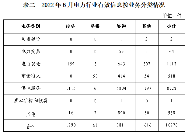 電力行業(yè)排在首位,有效信息數(shù)量為10778件,占全部有效信息的72.93%。群眾關(guān)注的內(nèi)容主要集中在供電服務(wù)、停電搶修、用戶受電工程市場秩序等方面。(2022年6月電力行業(yè)有效信息按業(yè)務(wù)分類情況見表二)