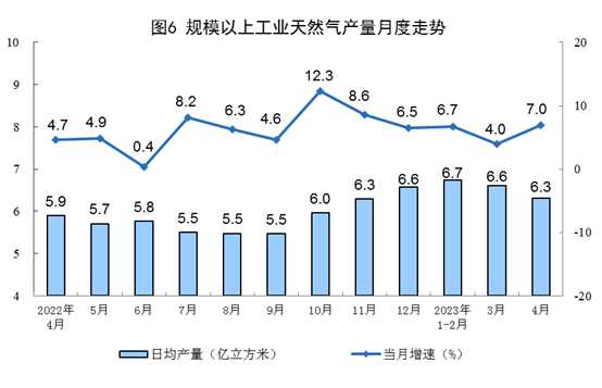 天然氣生產(chǎn)增速加快,進口保持較快增長。4月份,生產(chǎn)天然氣189億立方米,同比增長7.0%,增速比3月份加快3.0個百分點,日均產(chǎn)量6.3億立方米。進口天然氣898萬噸,同比增長11.0%,增速比3月份放緩0.6個百分點。
