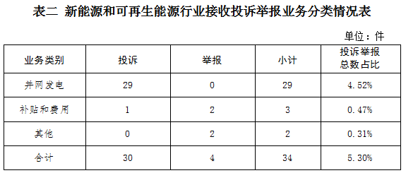 新能源和可再生能源行業(yè)排在第二位,數(shù)量為34件、占投訴舉報總數(shù)的5.30%,主要集中在并網(wǎng)發(fā)電、補(bǔ)貼和費(fèi)用等方面。