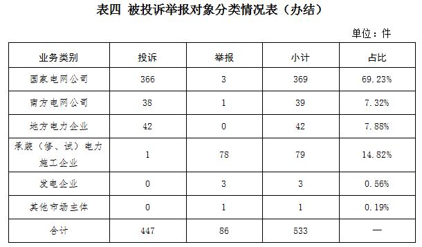 從被投訴舉報對象看,供電企業(yè)450件、占投訴舉報總數(shù)的84.43%,其中國家電網(wǎng)公司369件、占投訴舉報總數(shù)的69.23%,南方電網(wǎng)公司39件、占投訴舉報總數(shù)的7.32%,地方電力企業(yè)42件、占投訴舉報總數(shù)的7.88%;承裝(修、試)電力施工企業(yè)79件、占投訴舉報總數(shù)的14.82%;發(fā)電企業(yè)3件、占投訴舉報總數(shù)的0.56%;其他市場主體1件、占投訴舉報總數(shù)的0.19%。