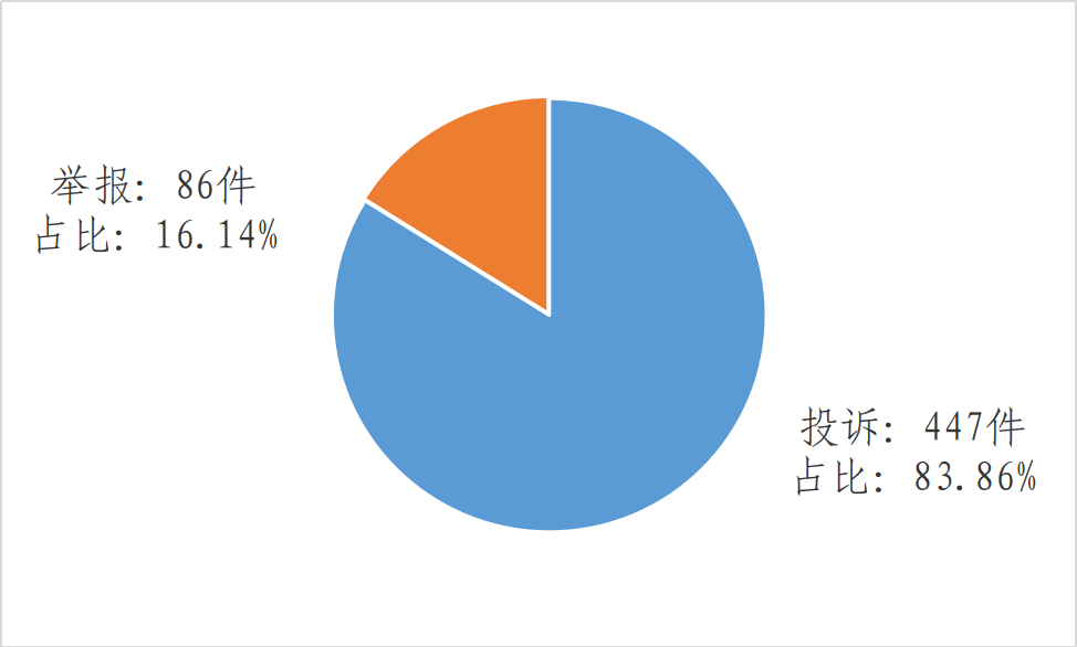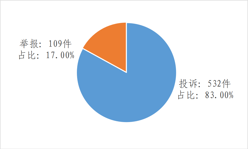 2023年4月,12398熱線共接收投訴舉報641件,環(huán)比增長1.26%、同比下降13.14%。其中:投訴532件,環(huán)比下降0.75%、同比下降27.12%;舉報109件,環(huán)比增長12.37%、同比增長105.66%。