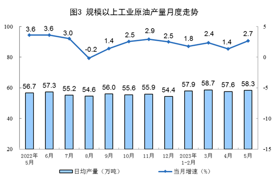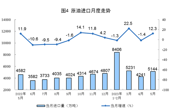 原油生產(chǎn)有所加快,進(jìn)口由降轉(zhuǎn)增。5月份,生產(chǎn)原油1807萬噸,同比增長2.7%,增速比4月份加快1.3個百分點,日均產(chǎn)量58.3萬噸。進(jìn)口原油5144萬噸,同比增長12.3%,4月份為下降1.4%。