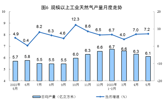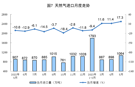 天然氣生產(chǎn)穩(wěn)步增長,進(jìn)口增速加快。5月份,生產(chǎn)天然氣190億立方米,同比增長7.2%,增速比4月份加快0.2個百分點,日均產(chǎn)量6.1億立方米。進(jìn)口天然氣1064萬噸,同比增長17.3%,增速比4月份加快5.9個百分點。