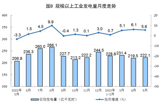 電力生產(chǎn)增速略有回落。5月份,發(fā)電6886億千瓦時,同比增長5.6%,增速比4月份回落0.5個百分點,日均發(fā)電222.1億千瓦時。1—5月份,發(fā)電34216億千瓦時,同比增長3.9%。