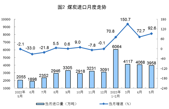 原煤生產(chǎn)保持穩(wěn)定,進(jìn)口持續(xù)高位增長。5月份,生產(chǎn)原煤3.9億噸,同比增長4.2%,增速比4月份放緩0.3個百分點,日均產(chǎn)量1243萬噸。進(jìn)口煤炭3958萬噸,同比增長92.6%,增速比4月份加快19.9個百分點。