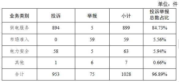電力行業(yè)排在首位,數(shù)量為1028件、占投訴舉報(bào)總數(shù)的96.89%,主要集中在供電服務(wù)、電力安全、市場準(zhǔn)入等方面。