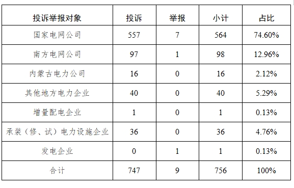 從被投訴舉報(bào)對象看,供電企業(yè)719件、占投訴舉報(bào)總數(shù)的95.11%,其中國家電網(wǎng)公司564件、占比74.60%,南方電網(wǎng)公司98件、占比12.96%,內(nèi)蒙古電力公司16件、占比2.12%,其他地方電力企業(yè)40件、占比5.29%,增量配電企業(yè)1件、占比0.13%;承裝(修、試)電力設(shè)施企業(yè)36件、占比4.77%;發(fā)電企業(yè)1件、占比0.13%。