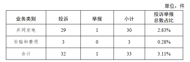 新能源和可再生能源行業(yè)排在第二位,數(shù)量為33件、占投訴舉報(bào)總數(shù)的3.11%,主要集中在并網(wǎng)發(fā)電方面。