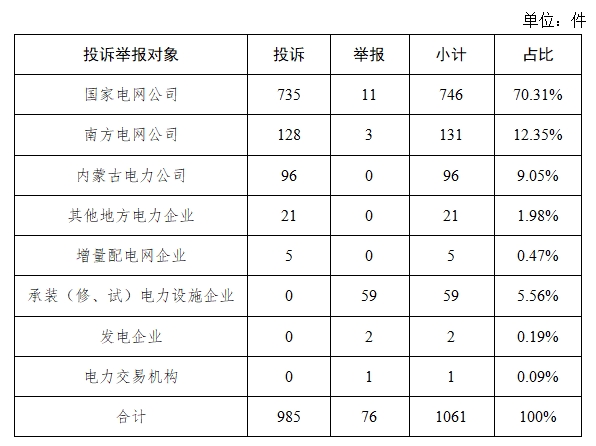 供電企業(yè)999件、占投訴舉報(bào)總數(shù)的94.16%,其中國家電網(wǎng)公司746件、占投訴舉報(bào)總數(shù)的70.31%,南方電網(wǎng)公司131件、占投訴舉報(bào)總數(shù)的12.35%,內(nèi)蒙古電力公司96件、占投訴舉報(bào)總數(shù)的9.05%,其他地方電力企業(yè)21件、占投訴舉報(bào)總數(shù)的1.98%,增量配電網(wǎng)企業(yè)5件、占投訴舉報(bào)總數(shù)的0.47%;承裝(修、試)電力設(shè)施企業(yè)59件、占投訴舉報(bào)總數(shù)的5.56%;發(fā)電企業(yè)2件,占投訴舉報(bào)總數(shù)的0.19%;電力交易機(jī)構(gòu)1件、占投訴舉報(bào)總數(shù)的0.09%。