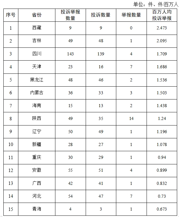 投訴舉報(bào)數(shù)量靠前的2個(gè)省份為四川(18件)、遼寧(14件)。