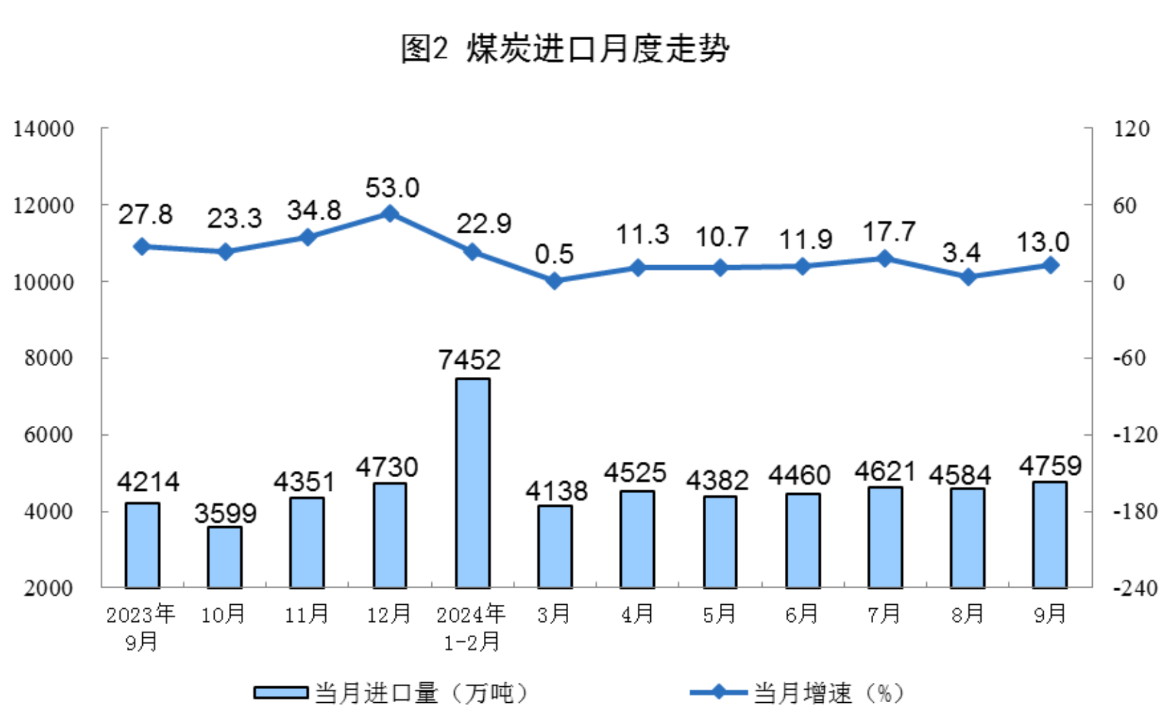 原煤生產(chǎn)增速加快。9月份,規(guī)上工業(yè)原煤產(chǎn)量4.1億噸,同比增長(zhǎng)4.4%,增速比8月份加快1.6個(gè)百分點(diǎn);日均產(chǎn)量1381.5萬噸。進(jìn)口煤炭4759萬噸,同比增長(zhǎng)13.0%。