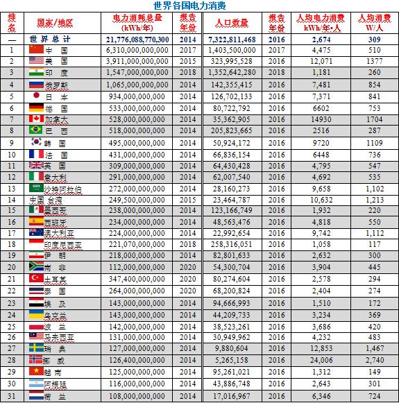 本表以電力消費(fèi)總量排序,中國居第一、美國第二、印度第三。