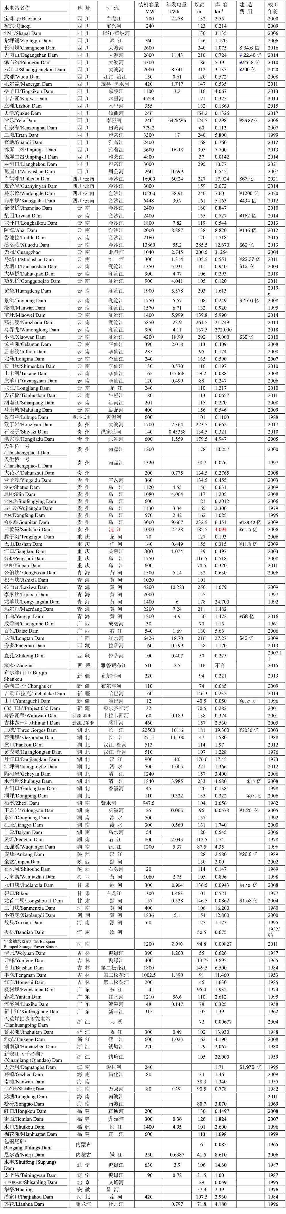 以下是中國正在運(yùn)營和在建的水壩和水庫的部分清單。由于國內(nèi)外的電力單位表述單位不一樣,本文的單位換算如下: