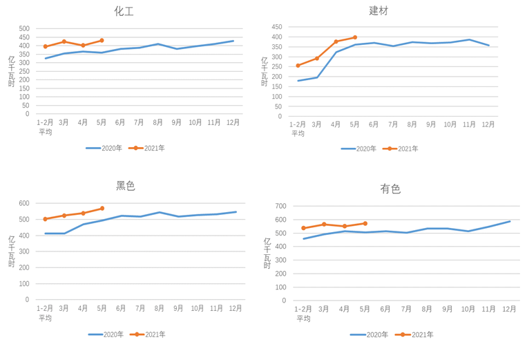 1-5月,化工行業(yè)用電量2048億千瓦時,同比增長12.8%,增速比上年同期提高17.0個百分點(diǎn);建材行業(yè)用電量1580億千瓦時,同比增長24.4%,增速比上年同期提高31.8個百分點(diǎn);黑色金屬冶煉行業(yè)用電量2639億千瓦時,同比增長18.3%,增速比上年同期提高19.8個百分點(diǎn);有色金屬冶煉行業(yè)用電量2763億千瓦時,同比增長10.2%,增速比上年同期提高8.2個百分點(diǎn)。
