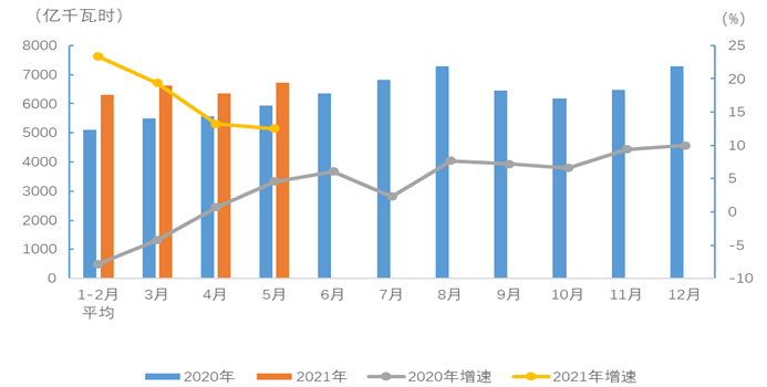 圖1 2020、2021年分月全社會用電量及其增速