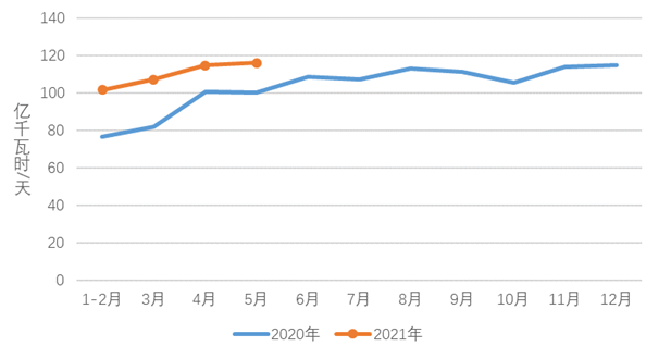 5月份,化工行業(yè)用電量431億千瓦時,同比增長14.8%,增速比上年同期提高16.9個百分點(diǎn);建材行業(yè)用電量398億千瓦時,同比增長9.0%,增速比上年同期提高2.5個百分點(diǎn);黑色金屬冶煉行業(yè)用電量569億千瓦時,同比增長14.6%,增速比上年同期提高12.5個百分點(diǎn);有色金屬冶煉行業(yè)用電量572億千瓦時,同比增長10.4%,增速比上年同期提高7.7個百分點(diǎn)。