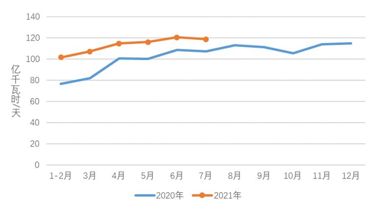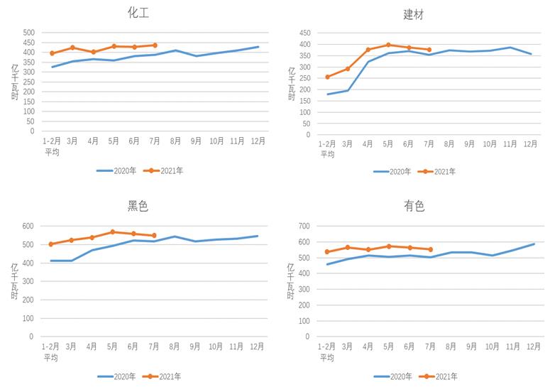 1-7月,化工行業(yè)用電量2911億千瓦時,同比增長11.4%,增速比上年同期提高14.2個百分點;建材行業(yè)用電量2343億千瓦時,同比增長17.1%,增速比上年同期提高19.5個百分點;黑色金屬冶煉行業(yè)用電量3749億千瓦時,同比增長14.5%,增速比上年同期提高14.2個百分點;有色金屬冶煉行業(yè)用電量3880億千瓦時,同比增長9.0%,增速比上年同期提高6.9個百分點。