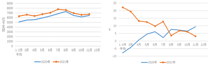 1-11月份,全國工業(yè)用電量同比增長10.2%,增速同比提高8.1個百分點。全國制造業(yè)用電量同比增長10.9%,增速同比提高8.5個百分點。制造業(yè)中,四大高載能行業(yè)合計用電量同比增長7.4%,其中,建材行業(yè)同比增長8.3%,黑色行業(yè)同比增長7.7%,化工行業(yè)同比增長7.4%,有色行業(yè)用電量同比增長6.4%;高技術及裝備制造業(yè)合計用電同比增長17.0%,其中,電氣機械和器材制造業(yè)、計算機/通信和其他電子設備制造業(yè)、通用設備制造業(yè)、儀器儀表制造業(yè)、汽車制造業(yè)同比增長超過15%,分別為25.2%、21.1%、17.5%、17.1%和16.8%;消費品制造業(yè)合計用電同比增長13.6%,其中,家具制造業(yè)、紡織服裝/服飾業(yè)、文教/工美/體育和娛樂用品制造業(yè)、木材加工和木/竹/藤/棕/草制品業(yè)、皮革/毛皮/羽毛及其制品和制鞋業(yè)、紡織業(yè)同比增長超過15%,分別為19.9%、18.4%、18.1%、17.8%、17.0%和16.0%。