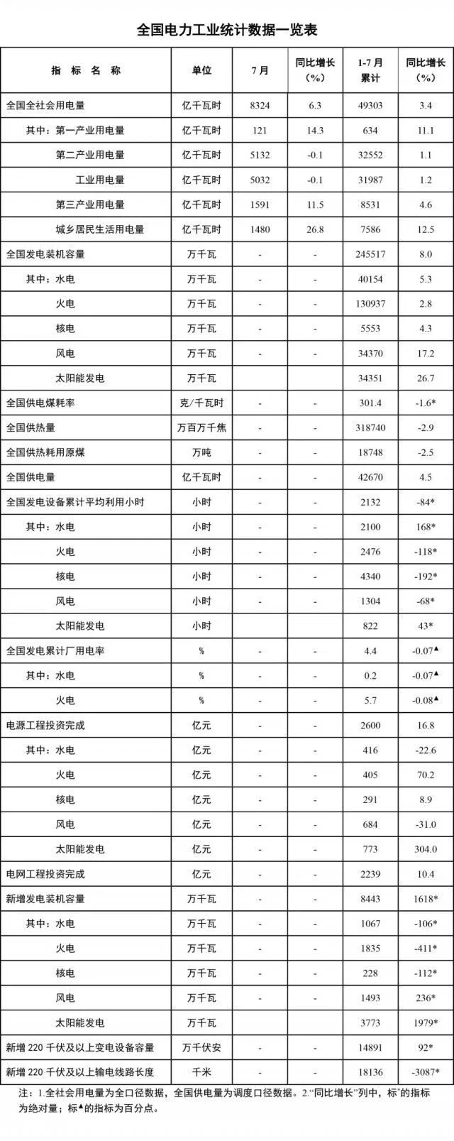 本網(wǎng)訊 8月19日,國家能源局發(fā)布1-7月份全國電力工業(yè)統(tǒng)計(jì)數(shù)據(jù)。截至7月底,全國發(fā)電裝機(jī)容量約24.6億千瓦,同比增長8.0%。其中,風(fēng)電裝機(jī)容量約3.4億千瓦,同比增長17.2%;太陽能發(fā)電裝機(jī)容量約3.4億千瓦,同比增長26.7%。