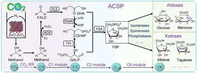 己糖是在自然界廣泛分布、與機(jī)體營(yíng)養(yǎng)代謝最為密切的糖的統(tǒng)稱。迄今為止,人類(lèi)對(duì)糖的獲取主要依賴于植物類(lèi)生物質(zhì)資源。然而,這種傳統(tǒng)的“二氧化碳-生物質(zhì)資源-糖”的加工過(guò)程,受到植物光合作用能量轉(zhuǎn)換效率限制;更重要的是,由于土地退化和短缺、生態(tài)系統(tǒng)退化、全球變暖導(dǎo)致的極端天氣和自然災(zāi)害,使依賴于糖類(lèi)生物質(zhì)資源的生產(chǎn)方式面臨著原料供應(yīng)的安全和風(fēng)險(xiǎn)。