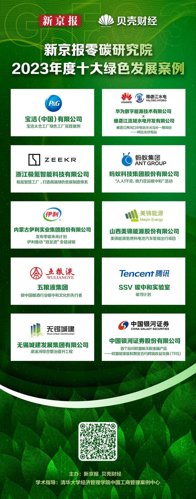 12月12日,在新京報零碳研究院2023綠色發(fā)展峰會上,由新京報零碳研究院和清華大學經(jīng)管學院中國工商管理案例中心共同評選出的“2023年度綠色發(fā)展十大案例”正式公布。入圍案例涵蓋新能源大規(guī)模開發(fā)利用、城市生態(tài)治理、綠色制造、低碳技術、碳足跡、碳金融和碳普惠等重點領域,基本代表了2023年度綠色發(fā)展的主要方向。其中,中國銀河、無錫城建、螞蟻集團、伊利、騰訊、寶潔中國、五糧液、極氪、山西美錦能源、華為數(shù)字能源等項目入圍。加強“雙碳”相關項目和技術試點示范對推動和引領經(jīng)濟社會各領域綠色低碳轉型至關重要。