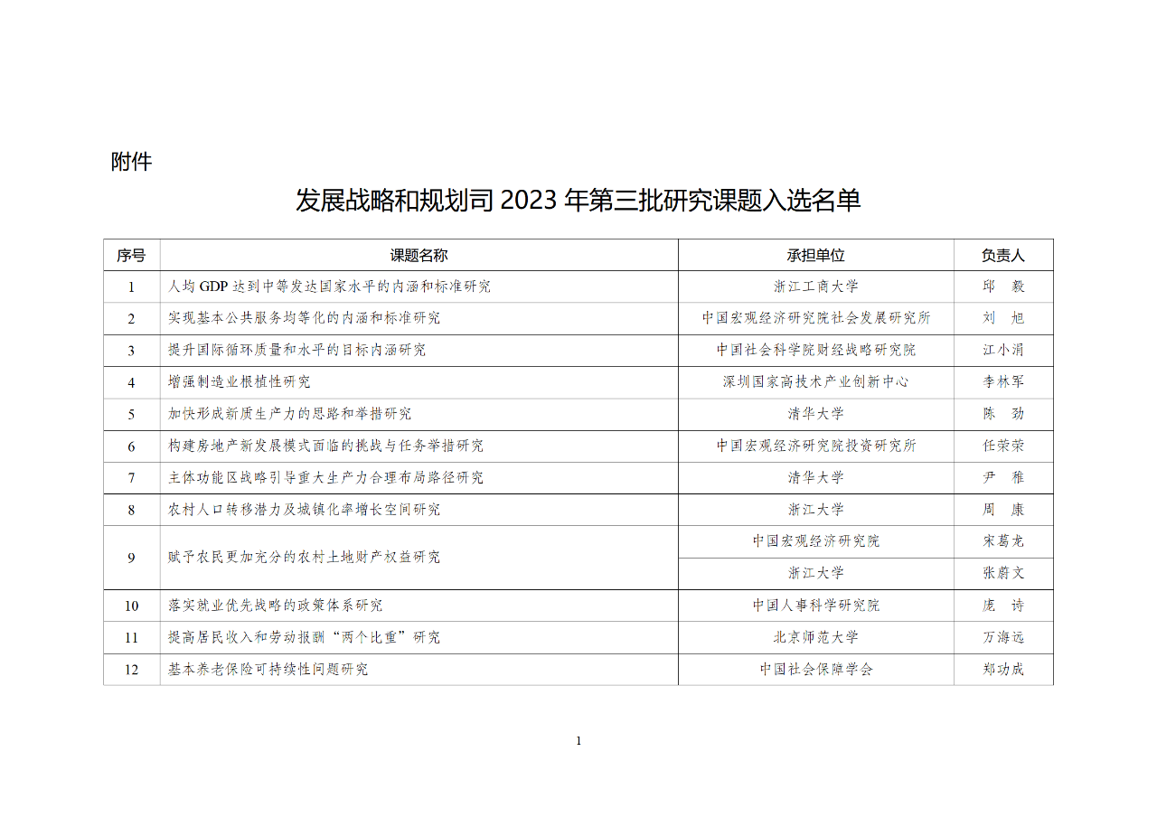 2023年10月20日,我司在國家發(fā)展改革委網(wǎng)站上公開發(fā)布《國家發(fā)展改革委發(fā)展戰(zhàn)略和規(guī)劃司2023年第三批研究課題征集公告》,得到了眾多研究機(jī)構(gòu)及科研院所的積極響應(yīng)和大力支持。經(jīng)嚴(yán)格評審,現(xiàn)確定了相關(guān)課題的承擔(dān)單位及負(fù)責(zé)人(詳見附件)。近日,我司將與各承擔(dān)單位聯(lián)系,辦理相關(guān)手續(xù)。