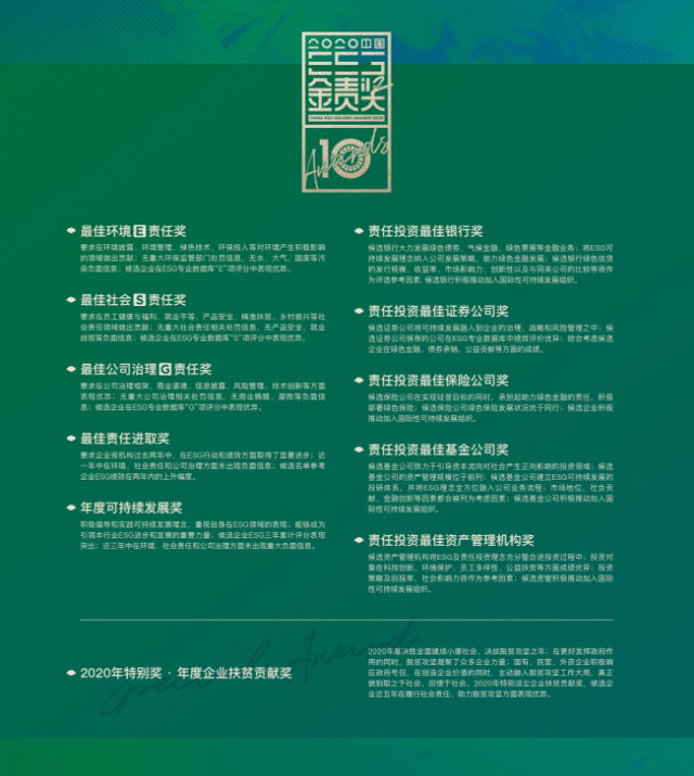本次評選設置有最佳環(huán)境(E)責任獎、最佳社會(S)責任獎、最佳公司治理(G)責任獎、最佳責任進取獎、年度可持續(xù)發(fā)展獎、責任投資最佳銀行獎、責任投資最佳證券公司獎、責任投資最佳保險公司獎、責任投資最佳基金公司獎、責任投資最佳資產(chǎn)管理機構(gòu)獎十個大獎。此外,2020年是決勝全面建成小康社會、決戰(zhàn)脫貧攻堅之年,評選特別增設企業(yè)扶貧貢獻獎。獎項候選名單是基于企業(yè)公開信息、新聞輿情等資料及權(quán)威數(shù)據(jù)庫綜合評估后所得。