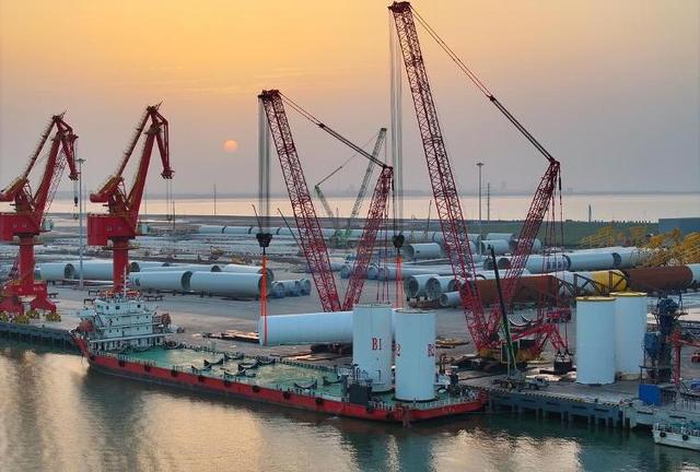 在東營(yíng)經(jīng)濟(jì)技術(shù)開發(fā)區(qū)廣利港風(fēng)電碼頭,工人對(duì)海上風(fēng)電塔筒進(jìn)行吊裝作業(yè)。(□記者 盧鵬 通訊員 周廣學(xué) 報(bào)道)
