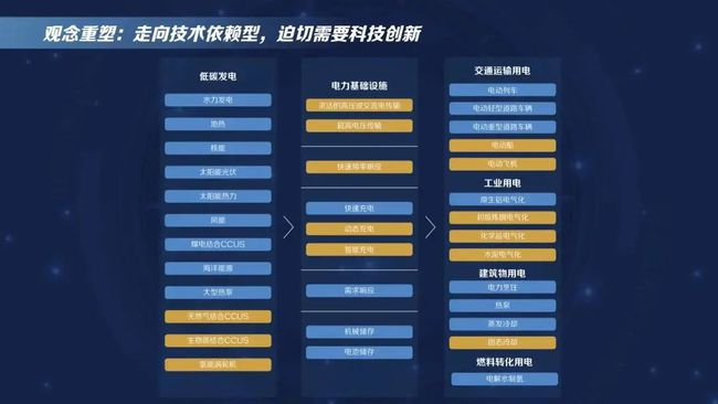 國(guó)際能源署(IEA)給出的技術(shù)評(píng)估,分別對(duì)低碳發(fā)電、電力基礎(chǔ)設(shè)施、交通運(yùn)輸用電、工業(yè)用電、建筑物用電、燃料轉(zhuǎn)化用電等技術(shù)做了梳理分析,在低碳發(fā)電領(lǐng)域像太陽(yáng)能光伏發(fā)電等技術(shù)已經(jīng)基本比較成熟,可以走向市場(chǎng);在電力基礎(chǔ)設(shè)施領(lǐng)域,智能充電等技術(shù)目前還需要進(jìn)一步研發(fā)、競(jìng)爭(zhēng),才能推向市場(chǎng)。IEA2021年的最新報(bào)告顯示在全球能源行業(yè)的路線圖里,2050年實(shí)現(xiàn)凈零排放的關(guān)鍵技術(shù)中,50%目前尚未成熟,需要進(jìn)一步研發(fā)提升,可見走向技術(shù)依賴型的經(jīng)濟(jì)發(fā)展模式對(duì)科技創(chuàng)新的需求更加迫切。