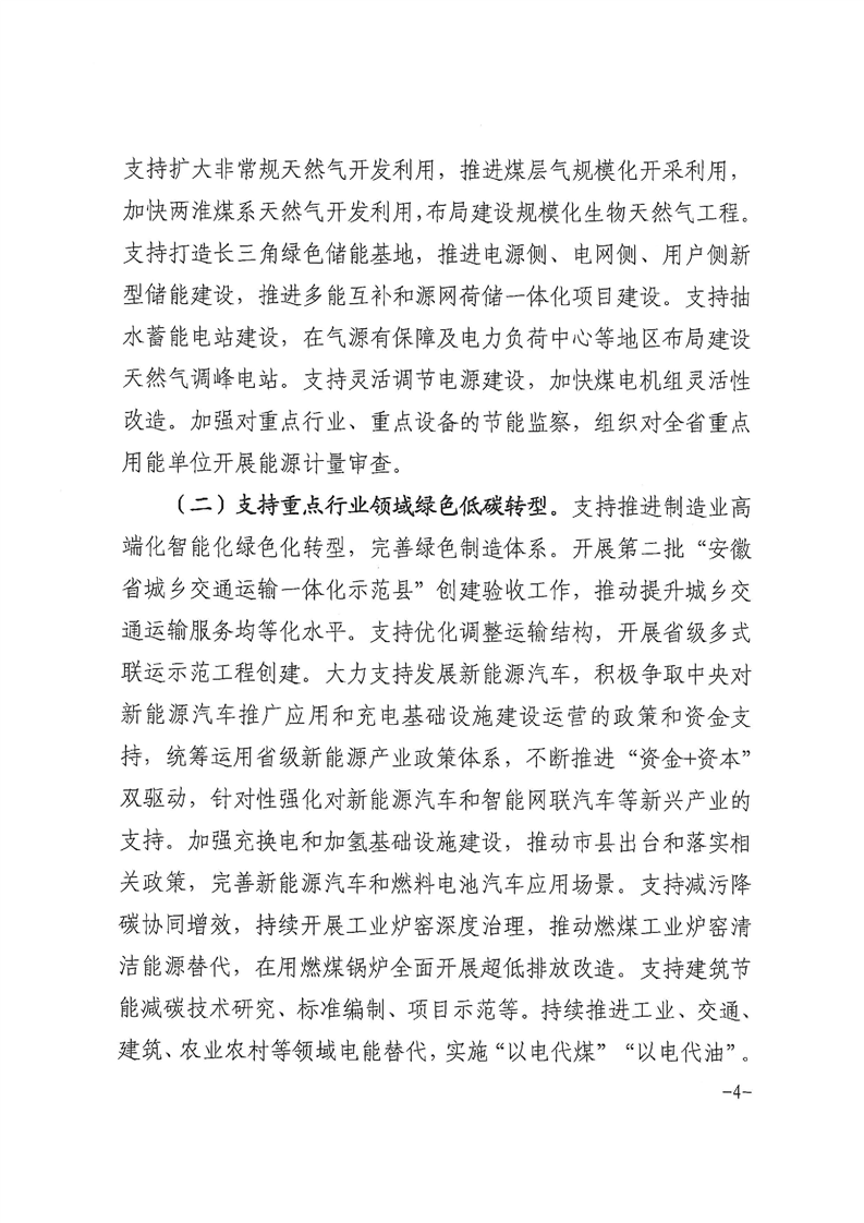 通知指出,支持企業(yè)開展節(jié)能減煤技術改造,重點削減非電力用煤,提高電力用煤比例。大力支持可再生能源高比例應用,支持光伏發(fā)電和風電資源開發(fā),推進生物質(zhì)能發(fā)電、清潔供暖、熱電聯(lián)產(chǎn)、生物質(zhì)天然氣等多元化發(fā)展。支持擴大非常規(guī)天然氣開發(fā)利用,推進煤層氣規(guī)?;_采利用,加快兩淮煤系天然氣開發(fā)利用,布局建設規(guī)?;锾烊粴夤こ?。支持打造長三角綠色儲能基地,推進電源側(cè)、電網(wǎng)側(cè)、用戶側(cè)新型儲能建設,推進多能互補和源網(wǎng)荷儲一體化項目建設。支持抽水蓄能電站建設,在氣源有保障及電力負荷中心等地區(qū)布局建設天然氣調(diào)峰電站。支持靈活調(diào)節(jié)電源建設,加快煤電機組靈活性改造。加強對重點行業(yè)、重點設備的節(jié)能監(jiān)察,組織對全省重點用能單位開展能源計量審查。