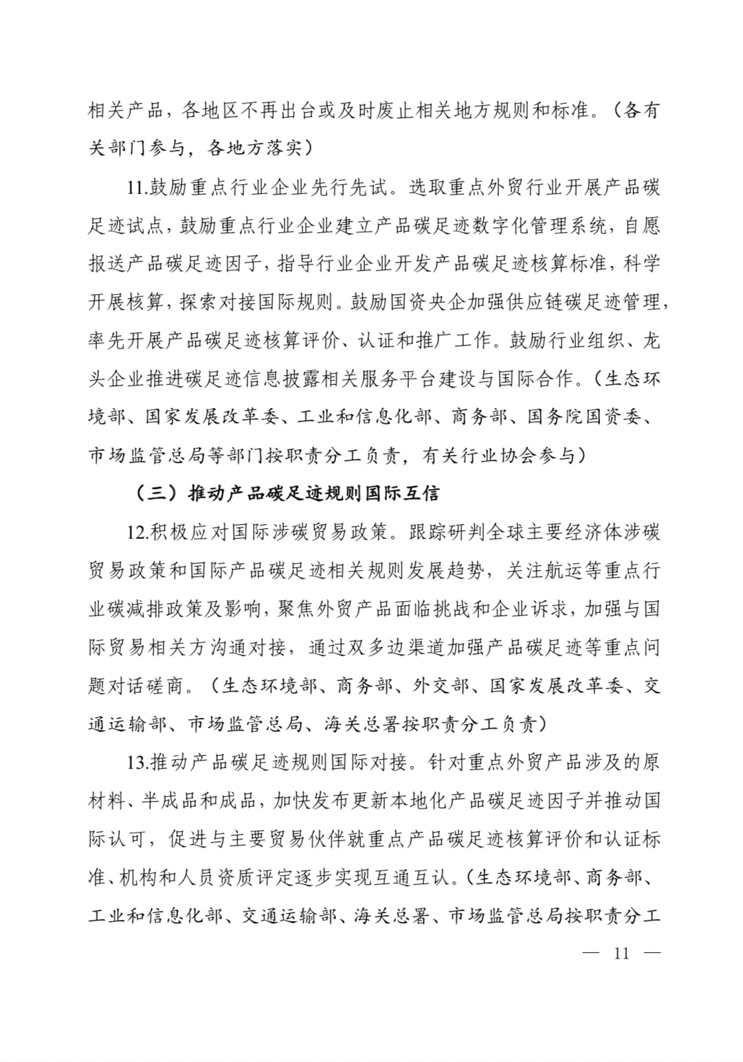 為深入貫徹落實(shí)《中共中央 國(guó)務(wù)院關(guān)于全面推進(jìn)美麗中國(guó)建設(shè)的意見(jiàn)》《中共中央 國(guó)務(wù)院關(guān)于完整準(zhǔn)確全面貫徹新發(fā)展理念做好碳達(dá)峰碳中和工作的意見(jiàn)》和《2030年前碳達(dá)峰行動(dòng)方案》部署要求,加快建立碳足跡管理體系,形成綠色低碳供應(yīng)鏈和生產(chǎn)生活方式,推動(dòng)新質(zhì)生產(chǎn)力發(fā)展,助力實(shí)現(xiàn)碳達(dá)峰碳中和目標(biāo),生態(tài)環(huán)境部會(huì)同國(guó)家發(fā)展改革委、工業(yè)和信息化部、財(cái)政部、人力資源社會(huì)保障部、住房城鄉(xiāng)建設(shè)部、交通運(yùn)輸部、商務(wù)部、中國(guó)人民銀行、國(guó)務(wù)院國(guó)資委、海關(guān)總署、市場(chǎng)監(jiān)管總局、金融監(jiān)管總局、中國(guó)證監(jiān)會(huì)、國(guó)家數(shù)據(jù)局制定了《關(guān)于建立碳足跡管理體系的實(shí)施方案》。現(xiàn)印發(fā)給你們,請(qǐng)認(rèn)真抓好落實(shí)。