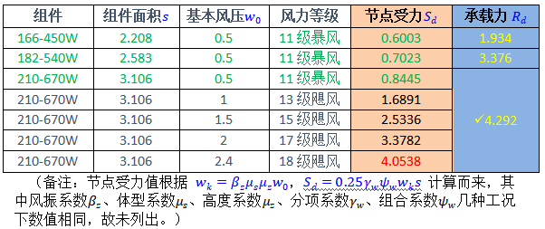 再以青海省作為項(xiàng)目實(shí)例說明,取全省最大基本風(fēng)壓0.5kN/m2為計算值,參考規(guī)范GB5009-2012《荷載規(guī)范》、GB 50429-2007 《鋁合金結(jié)構(gòu)設(shè)計規(guī)范》、NB/T10115-2018《光伏支架結(jié)構(gòu)設(shè)計規(guī)程》可知,全省范圍內(nèi)節(jié)點(diǎn)處作用力遠(yuǎn)小于組件連接處承載力,三款參考組件都處于安全狀態(tài)。(下表綠色數(shù)字部分)
