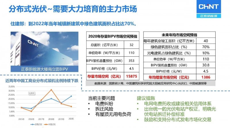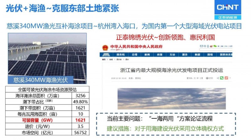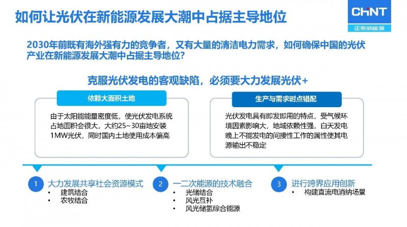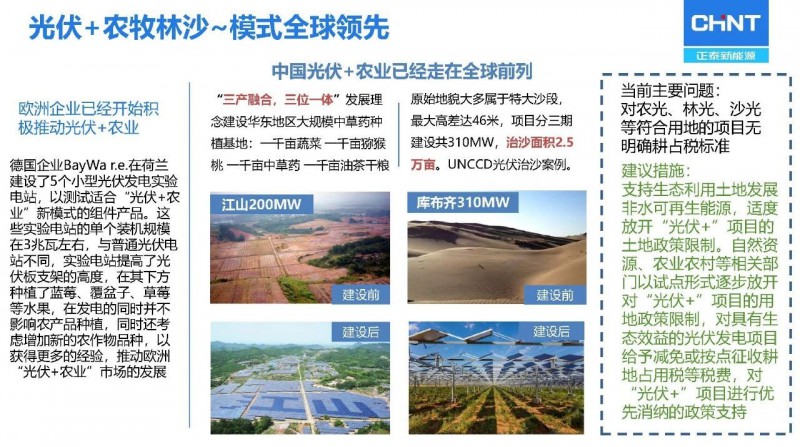 2021年2月3日,由中國光伏行業(yè)協(xié)會主辦的“光伏行業(yè)2020年發(fā)展回顧與2021年形勢展望網絡研討會”上,浙江正泰新能源開發(fā)有限公司總裁陸川針對我國目前光伏+融合發(fā)展模式趨勢進行了分析。我國已經走在了全球光伏+農業(yè)行業(yè)的前列,針對農光互補電站,他希望能夠推動自上而下的關于農光互補設施正常補償機制的兌現(xiàn)以促進行業(yè)更優(yōu)發(fā)展。光伏+海漁的合作方式適用于我國東南海岸,克服了東部土地緊張,不但能夠產生發(fā)電效益,同時還能產生漁業(yè)收益。光伏+儲能、光伏+風電、光伏+制氫等均為我國光伏應用新模式做出突出貢獻。戶用光伏的智能化應用、光伏+信號基站的互補應用、光伏+交通實現(xiàn)綠電出行等跨界創(chuàng)新的光伏應用模式也將逐漸推廣,實現(xiàn)全社會層面的綠電應用。