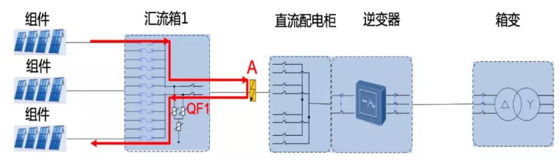 如上圖的A點發(fā)生短路故障,紅色故障回路:QF1為匯流箱斷路器,額定電流500A,由于組件的短路電流在480A左右,QF1一直不會脫扣,持續(xù)輸出直流能量到故障點,維持電弧燃燒,擴大火災(zāi)事故。