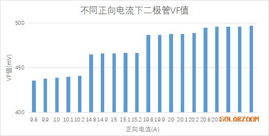 按照實(shí)測的兩個(gè)芯片VF值相差3mV來考量的話,將正向電流區(qū)間縮小再次測試,得到下圖數(shù)據(jù)。可以推測,如果雙芯片二極管兩個(gè)芯片間VF相差3mV,則2個(gè)芯片間分流相差不超過0.2A。實(shí)際上,在二極管結(jié)溫測試以及光伏組件戶外使用時(shí),0.2A的電流也是完全在誤差波動(dòng)范圍內(nèi)。