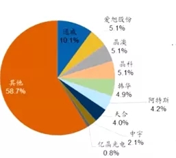 但是晶硅分為單晶硅和多晶硅,這兩者最大的區(qū)別是在于硅的純度和雜質(zhì)摻雜度。單晶硅具有較高的純度和較少的雜質(zhì),而多晶硅的純度較小且雜質(zhì)較多,所以單晶硅較多晶硅而言,單晶硅具有良好的導電性,同時也是主流的電池片。目前我國單晶硅市場份額占64.5%。這就說明在原材料的供應上不存在瓶頸。