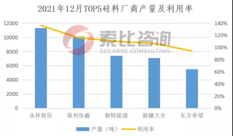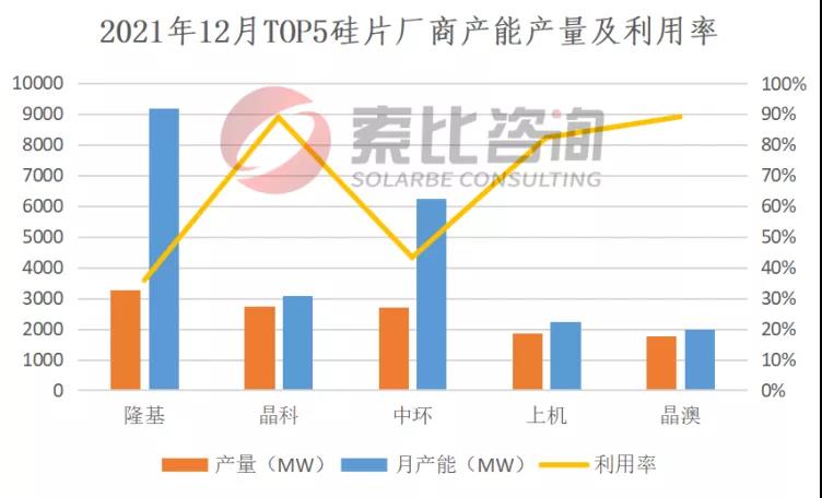 根據(jù)索比咨詢統(tǒng)計,2021年12月,前五大硅料企業(yè)總產(chǎn)量4.14萬噸,綜合產(chǎn)能利用率112.6%。硅片方面,兩家頭部企業(yè)開工率回至50%以上,一體化企業(yè)開工率相對較高。去年12月,國內硅片產(chǎn)量17.85GW,環(huán)比下降8.6%。按照產(chǎn)量排名,隆基、晶科、中環(huán)、上機、晶澳位列前五,總產(chǎn)量12.35GW,占比69.19%,綜合利用率67.81%。雖然有觀點認為,中環(huán)的實際產(chǎn)能利用率要高于上述數(shù)據(jù),但總體看,產(chǎn)業(yè)鏈上游價格居高不下,已經(jīng)影響到終端需求,并反作用于上游。