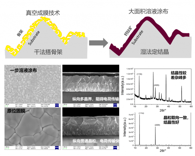 “極電光能在這方面有著自己獨創(chuàng)的‘氣相-液相’結(jié)合的兩步法鈣鈦礦制備技術,我們稱之為‘原位固膜’法,可以有效地解決‘一步溶液涂布法’所遇到的上述問題?!庇诓┦拷榻B到,通過“干法搭骨架,濕法定結(jié)晶”的策略,可以把溶劑揮發(fā)與化學成鍵分開、形核與晶粒生長分離,而且“骨架層”充當著結(jié)晶模板的作用,鈣鈦礦薄膜的結(jié)晶生長是在可控的條件下完成的,因此,受環(huán)境影響小,便于面積放大,工藝窗口寬,成品率高?!霸还棠ぁ惫に囍苽涞拟}鈦礦膜層質(zhì)量也顯著優(yōu)于“一步溶液涂布法”制備的鈣鈦礦材料,鈣鈦礦組件的效率更高。另外,它也可以在不平整的基底表面成膜,因此還可以很好的兼容與晶硅疊層電池的制備。