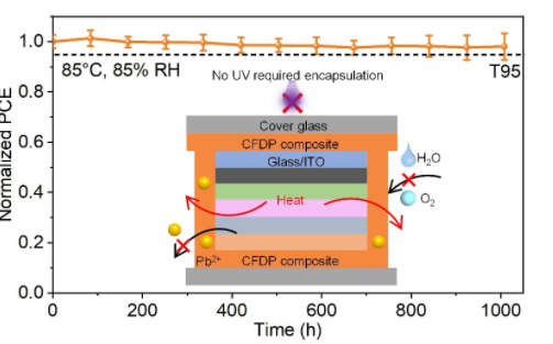 利用氟硅聚合物凝膠封裝的鈣鈦礦電池在高溫、高濕度(85℃、85%相對(duì)濕度)下運(yùn)行1000小時(shí),器件效率保持初始效率的98%,表現(xiàn)出了優(yōu)異的濕熱穩(wěn)定性。(西北工業(yè)大學(xué)材料學(xué)院納米能源中心供圖)