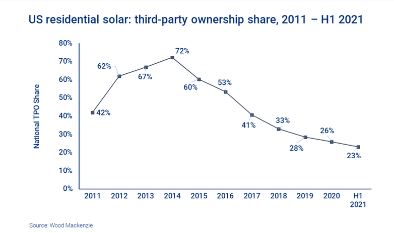 Sunrun公司鞏固了其作為最大TPO供應商的地位,在2021年上半年擁有68%的TPO市場份額。在可預見的未來也將如此,一部分原因是該公司收購了Vivint Solar(前第二大TPO供應商),該收購于2020年第四季度完成。