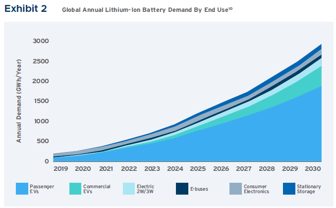 根據RMI公司的研究和彭博新能源財經公司的分析,到2030年,全球對鋰離子電池的需求預計將達到每年2.8TW。其中大部分將滿足電動汽車需求。