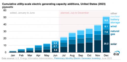 天然氣發(fā)電占2023年上半年美國(guó)新增產(chǎn)能的34%(5.7吉瓦),僅次于太陽能。2023年上半年并網(wǎng)的兩個(gè)最大項(xiàng)目是天然氣發(fā)電廠:俄亥俄州的1836兆瓦Guernsey發(fā)電站和伊利諾伊州的1214兆瓦CPV Three Rivers能源中心。