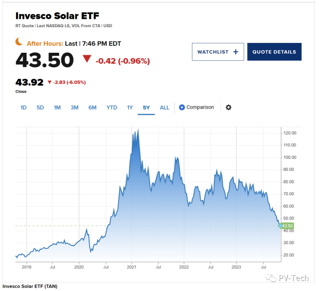 上周五(10月20日),Invesco Solar ETF(TAN)暴跌6.57%,最新交易價為44.18美元,創(chuàng)下2020年7月以來的最低水平。由于前景悲觀,太陽能行業(yè)股票普遍下跌。